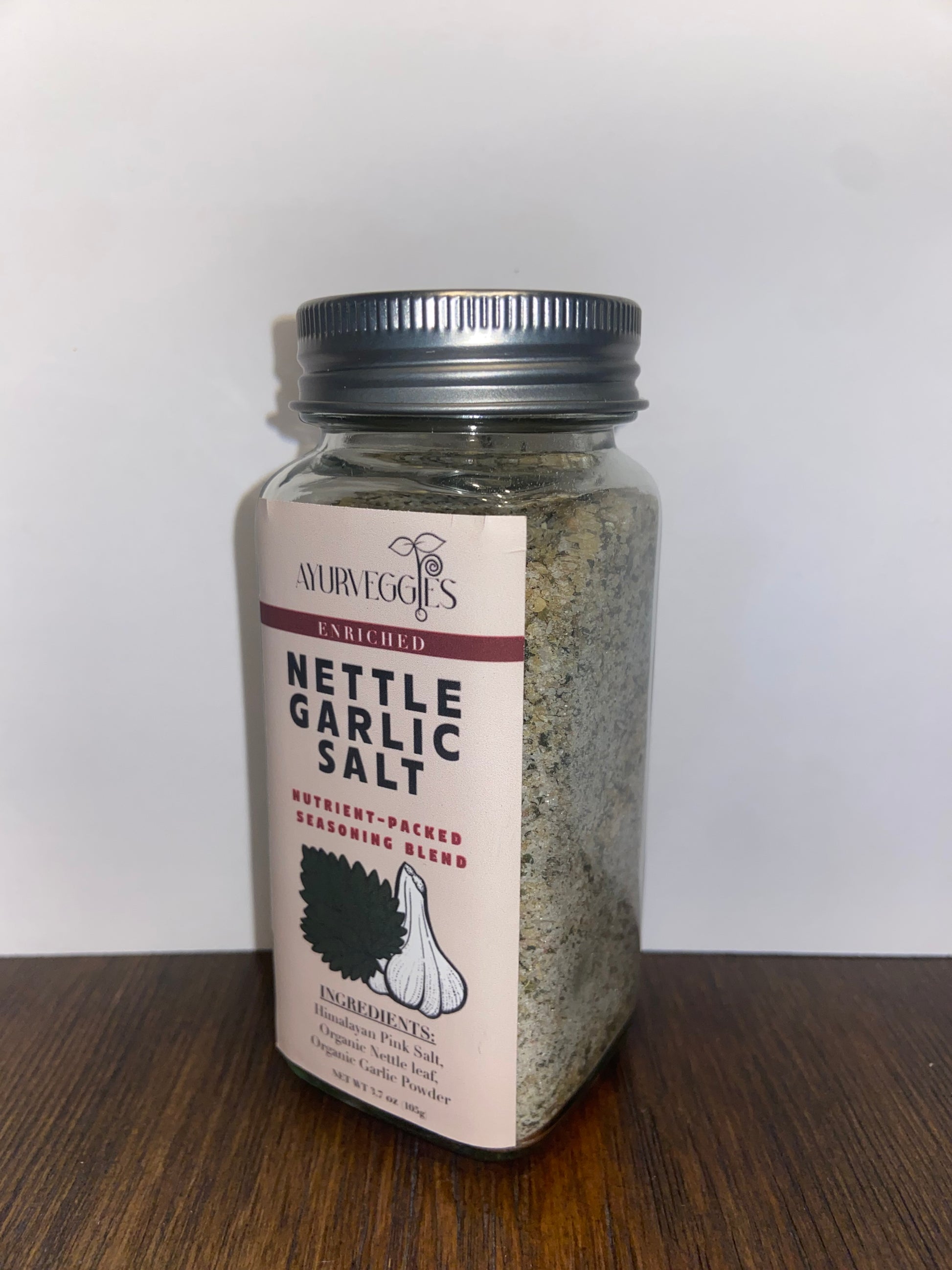 Elevate your everyday seasoning with AyurVeggies’ Nettle Garlic Salt — a bold, mineral-rich blend crafted in small batches using only the purest organic ingredients. Combining organic nettles, organic dehydrated garlic, and Himalayan pink salt, this functional seasoning delivers robust flavor while nourishing the body with essential nutrients.